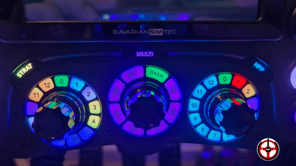 Puis, si on regarde en bas du volant, on aperçoit 3 sélecteurs rotatifs. Les deux latéraux sont des sélecteurs à 13 positions cerclés de LEDs dont l’affichage est géré par l’Adaptive BeamTec, une technologie apportée par Bavarian dans le monde du simracing et dont je vous parlerai un peu plus bas. Enfin, l’encodeur central, 8 positions, est le sélecteur du Multi-Link.