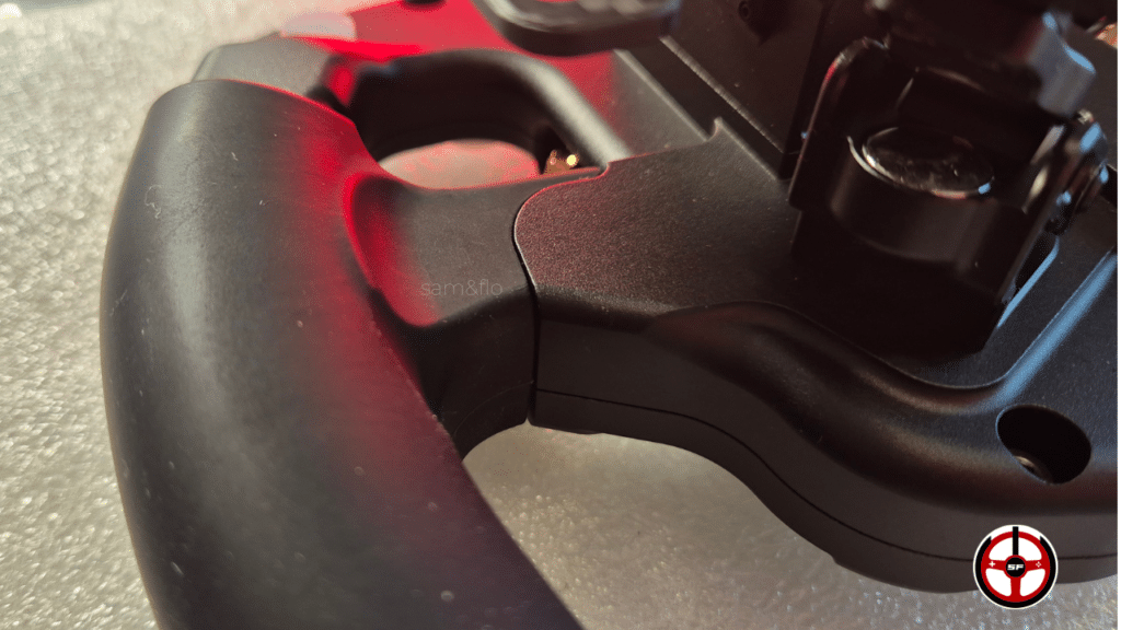 Pas simple ce paragraphe. Comment décrire un volant de ce niveau à sa juste valeur et sans me répéter ? Je ne sais pas… La prise en main est parfaite. Même Flo et ses toutes petites mains arrivent à être super à l’aise sur ce volant qui a pourtant des grips assez épais. Mais leur forme est tellement bien pensée que ça marche ! Les placements de boutons et d’encodeurs sont top, les palettes sont super agréables… C’est une mesterclasse voilà.