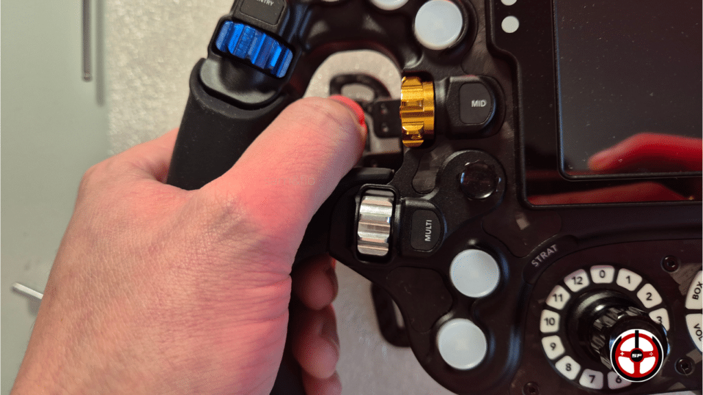 Je vous disais donc que le sélecteur central 8 positions va vous servir pour le Multi-Link. Quand vous allez tourner ce sélecteur, vous allez changer la fonction d’un (ou plusieurs) encodeur rotatif au niveau des pouces. Ça permet de multiplier les fonctions du volant de façon très efficace. Et pour le pilote, ça permet d’assigner toutes les touches dont vous pourriez avoir besoin même si vous faites des courses sur des catégories de véhicules très différentes. C’est une technologie qu’on retrouve sur d’autres volants haut de gamme comme les Ascher par exemple, et qui tend à se démocratiser doucement vers les volants milieu de gamme tels que le Conspit 300GT.