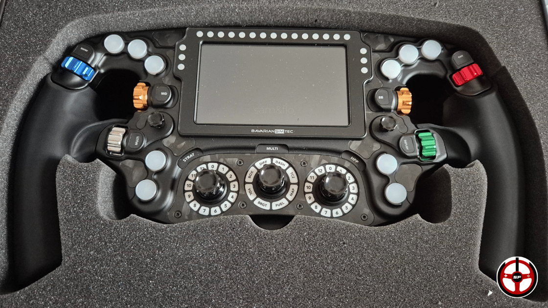 Déballer un Bavarian, c’est toujours une expérience spéciale. On se rassemble dans le salon, on ouvre délicatement le boîtier noir à la fermeture aimantée. Et là, on découvre le volant, siégeant comme un empereur dans son lit de mousse parfaitement ajusté. Flo siffle, je souris. Nous voilà en présence de l’un des volants de sim racing les plus aboutis (et chers) de l’histoire.