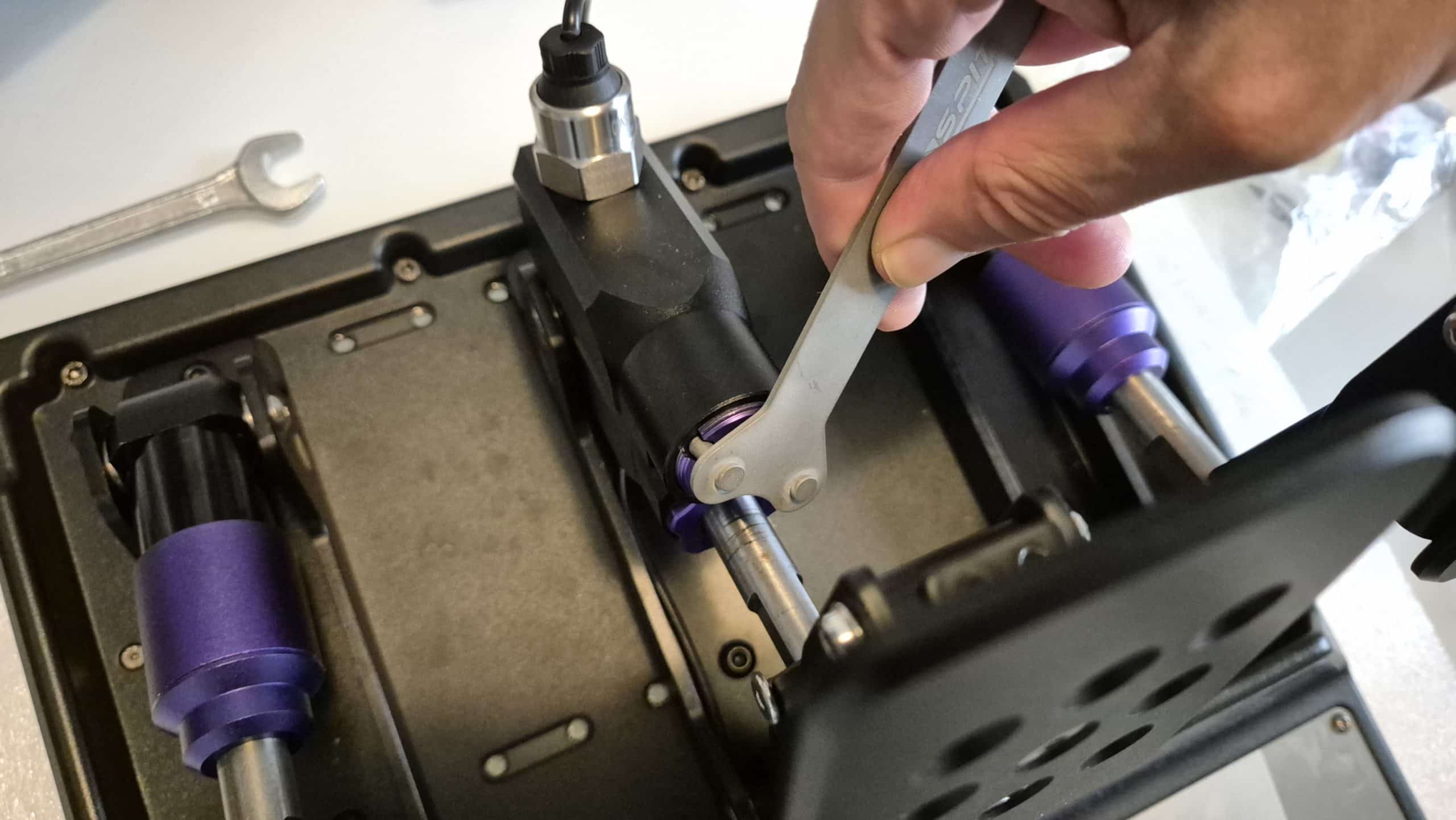 D’origine, le pédalier Simnet est livré avec 2 élastomères et 3 ressorts (dont un est déjà installé). Pour le changer, on va utiliser la clé spéciale fournie dans la boîte. Préparez du papier essuie-tout, c’est un conseil d’ami, vous allez être GRAS après ça.
