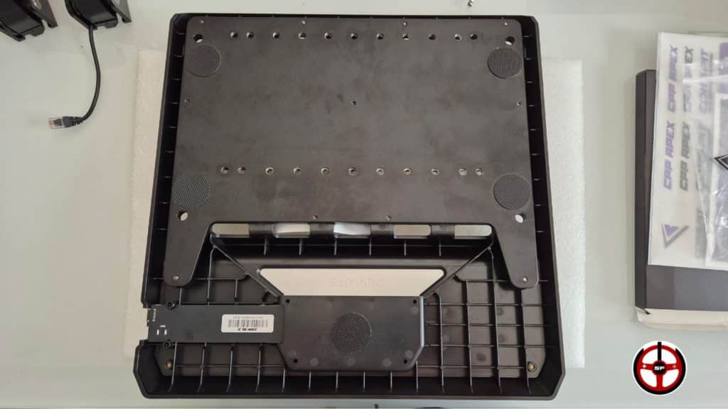 Quand on découvre le pédalier pour la première fois avec Flo, on est agréablement surpris. La qualité de finition générale est vraiment au rendez-vous. Les pédales sont en aluminium CNC, tout comme leurs plaquettes. La plaque de support est en plastique, (pour le côté finition extérieure) mais avec une plaque d’acier de 5mm d’épaisseur qui assure la rigidité dans la pose des pédales et la fixation sur châssis fixe. La zone « repose-pied » est agrémentée d’une petite plaque de finition en métal (jolie mais très salissante).