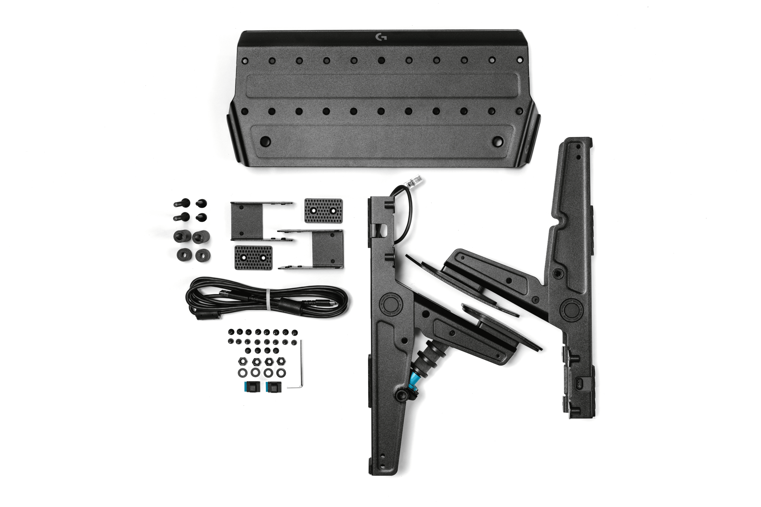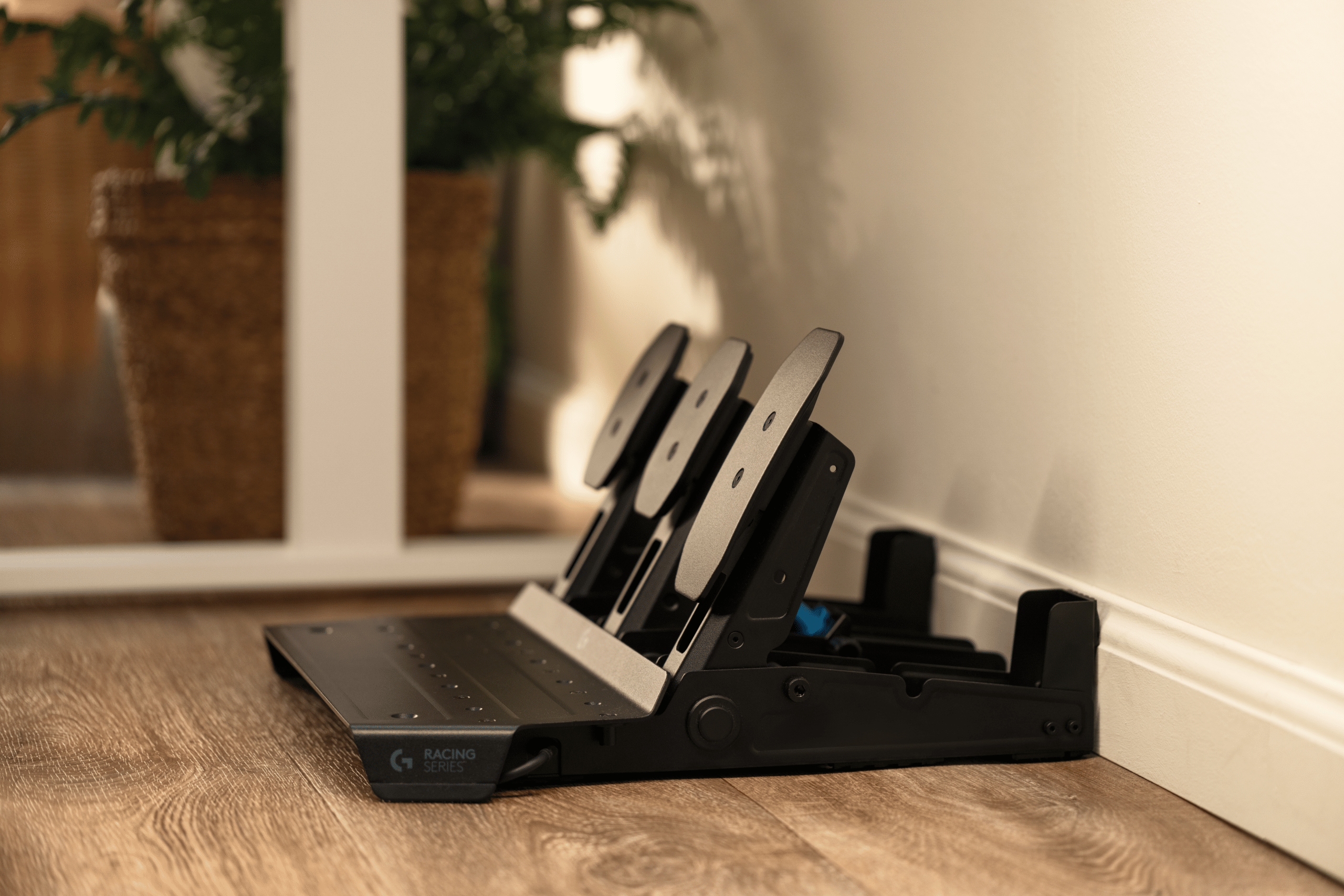 Le pédalier Logitech RS, c’est du standard. Une plaque percée pour positionner vos pédales précisément. D’après leur fiche tech, c’est full plastique, un choix audacieux qui n’est pas sans rappeler la direction prise par les Danois d’Asetek pour leur pédalier Initium. Un accélérateur à capteur magnétique à effet HALL et un frein Load Cell (capteur de force appliquée sur la pédale) d’une capacité max de 75Kg.