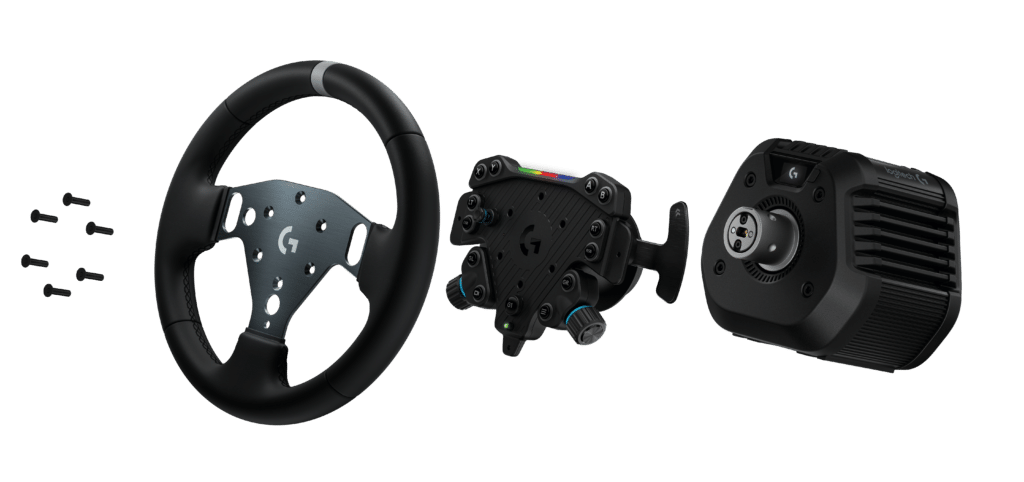 Bon, avoir une base Direct Drive c’est super mais encore vous faut-il un volant à mettre dessus ! Pour ce faire, la marque a prévu deux packs « Logitech G RS50 System ». À l’intérieur, vous retrouvez la base Direct Drive, un Hub RS Wheel équipé de palettes magnétiques, une roue ronde RS avec grip en silicone et une pince pour table.