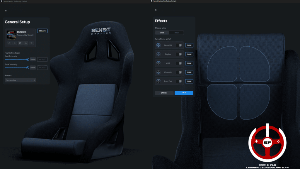 Pour installer le logiciel Sensit, je me rends sur la page de téléchargement de leur site. L’installation se fait en quelques minutes à peine et on est directement plongé dans un petit tuto qui va vérifier que le boîtier de contrôle est bien connecté à votre PC et vous présenter rapidement le menu. Si vous êtes impatient de tester votre siège, même pas besoin d’aller plus loin, lancez l’un des jeux compatibles et ça marchera sans autre démarche de votre part. Mais bien entendu, là où les choses vont devenir vraiment intéressantes, c’est en allant créer vos propres réglages personnalisés. On va donc voir comment ça se passe !